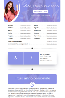 Il tuo tema numerologico conta tra le 10 e le 15 pagine secondo il tuo profilo. È un documento sostanziale, ricco di informazioni e consigli pratici, che potrai consultare durante tutto l'anno.
