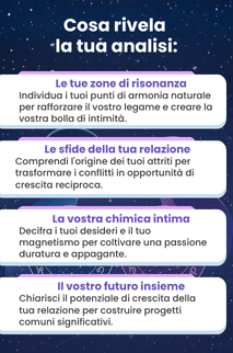 Un'analisi dettagliata della vostra sinastria (comparazione dei temi), redatta con cuore e precisione. Un documento prezioso accompagnato dalle mie raccomandazioni personalizzate, da leggere insieme o separatamente.
